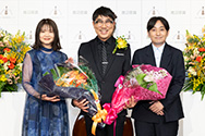- そして、亀田様のご活躍がVTRで会場にご紹介された後、ミキ理事長代行から亀田誠治様へ「渡辺晋賞」のトロフィーと副賞の100万円が授与されました